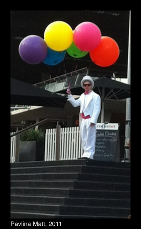 Balloons are good, but giant balloons being held by a guy in a white tux are great!